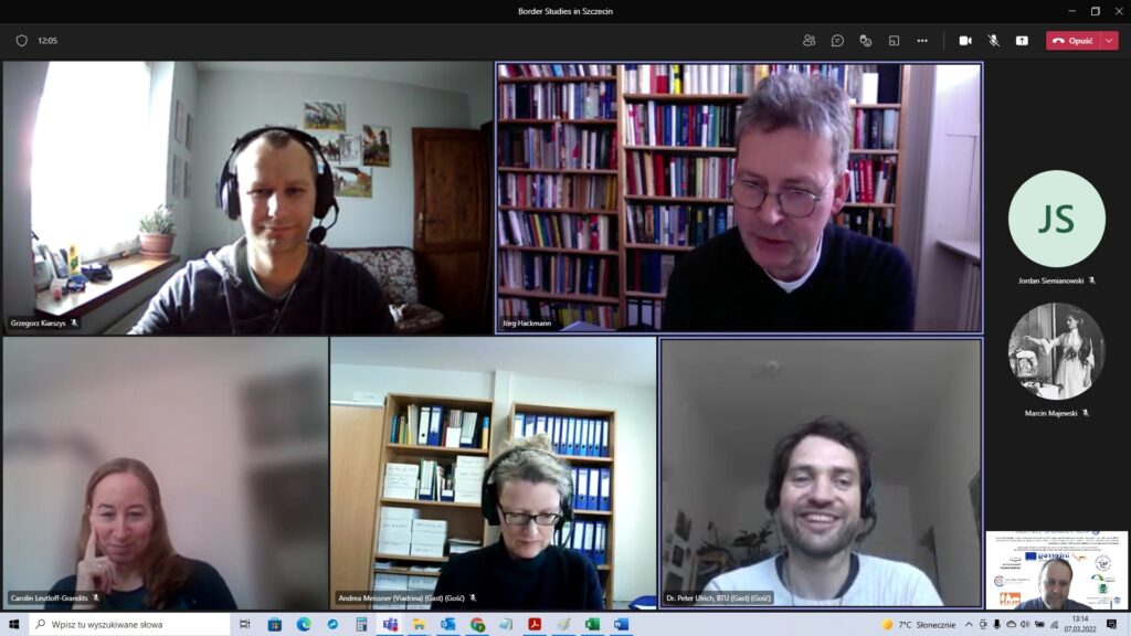 Der erste Workshop „Perspektiven der Border Region Studies in Szczecin“ / Workshop „Perspektiven der Border Region Studies in Szczecin“ wurde am 7. März 2022 online durchgeführt. Ziel des Workshops war es, den Partnern und eingeladenen Experten das Programm und die Annahmen eines englischsprachigen Studiengangs zum Thema „Borders and Boundaries Studies“ vorzustellen und zu diskutieren, der von einem Team von Mitarbeitern des Historischen Instituts der Universität Szczecin unter der Leitung von Dr. Paweł Migdalski entwickelt wurde. Das Masterstudium soll auf Englisch durchgeführt werden und umfasst ein breites interdisziplinäres Spektrum an Kenntnissen und Fähigkeiten. Zu den Teilnehmern gehörten Mitarbeiter des Zentrums B/ORDERS IN MOTIONS an der Europa-Universität Viadrina in Frankfurt (Oder) und der Brandenburgischen Technischen Universität (BTU) Cottbus-Senftenberg. Der Workshop war sehr fruchtbar, und die Kommentare und Ratschläge der Experten werden sicherlich zur Entwicklung des bestmöglichen Studienangebots beitragen.