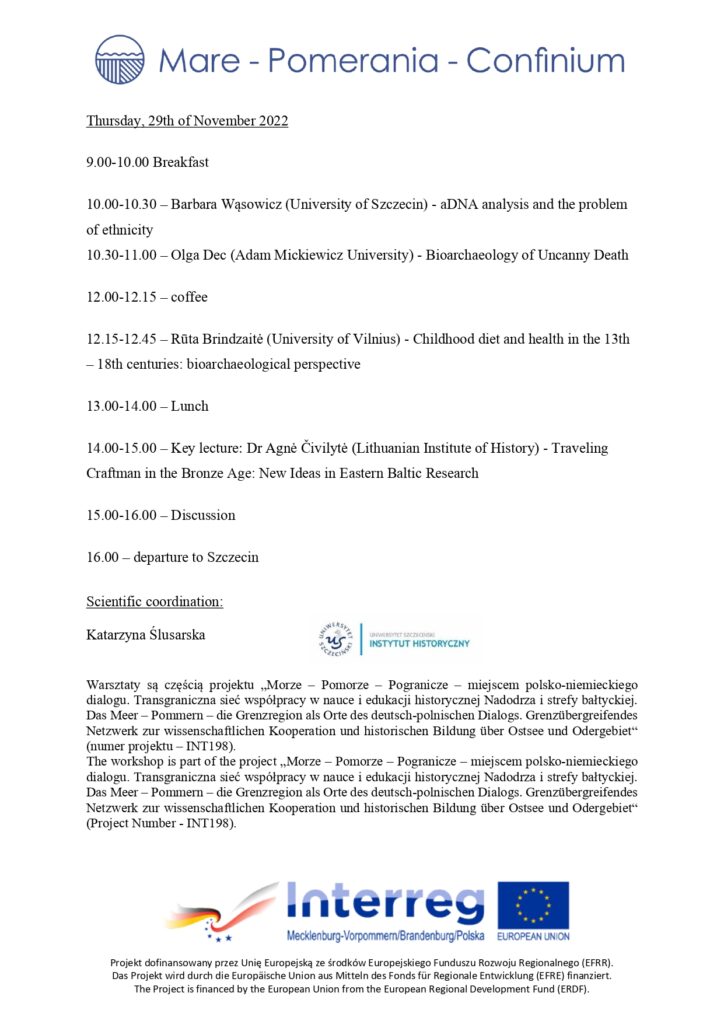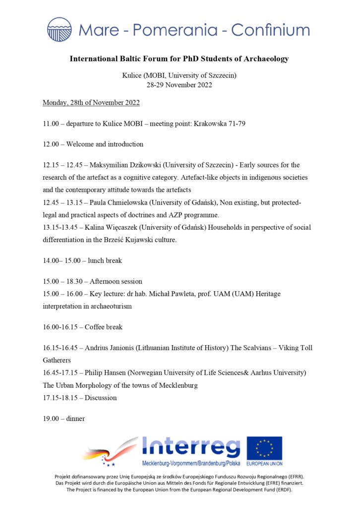 Am 28. und 29.11.2022 veranstaltete das Internationale Zentrum für interdisziplinäre Forschung (MOBI) der Universität Szczecin in Kulice ein weiteres Treffen im Rahmen des Projekts Mare-Pomerania-Confinium. Diesmal fand es im Format eines internationalen Forums für Doktoranden statt: International Baltic Forum for PhD Students of Archaeology. In der intimen Atmosphäre des MOBI wurden Vorträge von Doktoranden aus wissenschaftlichen Zentren in Polen und im Ausland gehalten. Während des Workshops wurden auch zwei Vorträge von geladenen Gästen gehalten. Am ersten Tag des Workshops fand der Vortrag mit dem Titel „Heritage Interpretation in Archaeoturism. Interpretation des Kulturerbes in der Archäoturistik, Vortrag von Michał Pawleta, PhD, Professor an der Adam-Mickiewicz-Universität in Poznań. Am zweiten Tag hatten die Teilnehmer die Gelegenheit, einen Vortrag von Dr. Agnė Čivilytė (Litauisches Institut für Geschichte, Vilnius) mit dem Titel Traveling Craftman in the Bronze Age: New Ideas in Eastern Baltic Research zu hören.